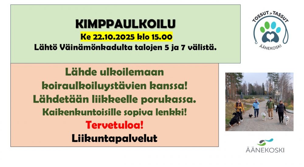 Kimppaulkoilu kaikenkuntoisille. Lähtö Väinömönkadulta talojen 5 ja 7 välistä.