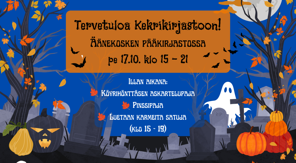 Tervetuloa Kekrikirjastoon! Luvassa on kaikenlaista karmivaa tekemistä Halloweenin hengessä. Uskallatko tulla käymään?