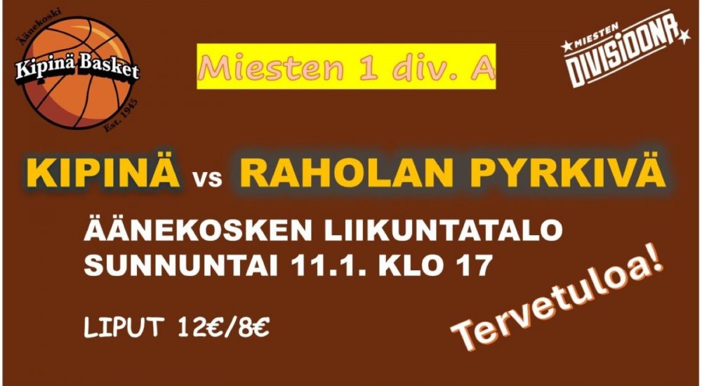 Kipinä Basket kohtaa kevätkauden ensimmäisessä kotipelissään Raholan Pyrkivän sunnuntaina 11.1. kello 17. Lämpimästi tervetuloa Liikkarille!