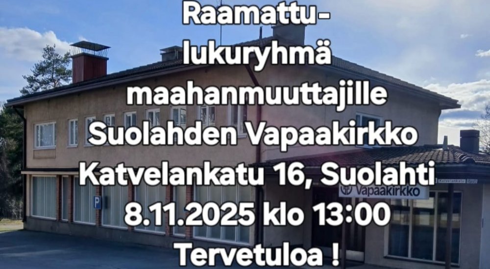Raamattu-lukuryhmä.maahanmuuttaneille. Suolahden Vapaakirkko, Katvelankatu 16, 44200 Suolahti. Lauantaina 8. marraskuuta 2025 klo 13:00 Maahanmuuttaneiden Raamattu-lukuryhmään hyvän sanoman ää...