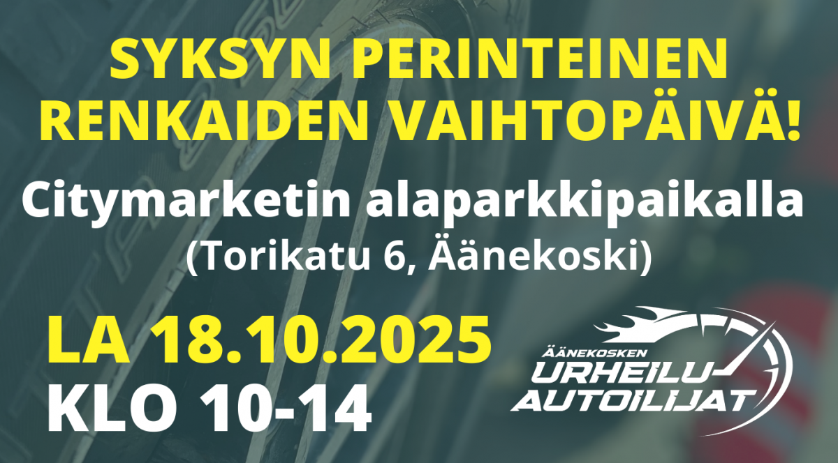 Talvi lähestyy ja nyt on aika vaihtaa talvirenkaat alle! Äänekosken perinteinen renkaanvaihtopäivä tulee taas, mutta tällä kertaa uudella sijainnilla. Nyt voit vaihdattaa renkaat kauppareissun aikana!