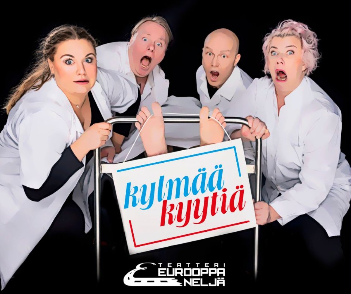 Teatteri Eurooppa Neljän väki rymyää manalan porteille hymy suupielessä ja laulu leukaperissä. Tämä iloittelu avaa niin ruumiin kuin mielenkin — tervetuloa!