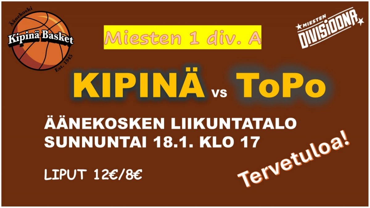 Kipinä Basket saa sunnuntaina 18.1. vieraakseen kovatasoisen helsinkiläisjoukkueen Torpan Pojat (ToPo). Ottelu alkaa kello 17 ja paikkana on Kipinän kotisali - Äänekosken Liikuntatalo. Lämpimästi ter...