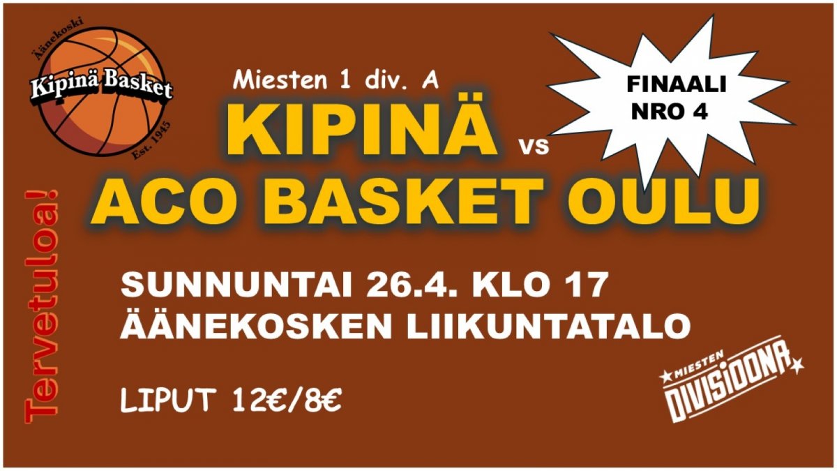 Kipinä Basket ja ACO Basket Oulu finaaliottelu nro 4 räjähtää käyntiin Liikuntatalolla sunnuntaina 26.4. kello 17. Nyt lauteet pullolleen ja kannustus ylimmilleen!! Taistele Kipinä, taistele!